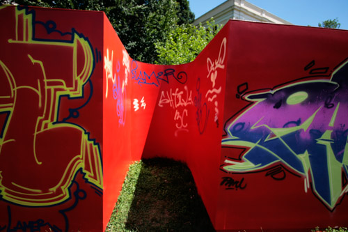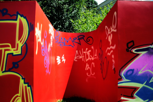 A: As a 21st Century Trojan horse where a dirty word is presented as a 20th modernist sculpture enclosed with its’ minimalistic architecture and painted ruby red on the outside. But when one enters they find themselves surrounded by the imagery of 14 contemporary artists of today, in a visual labyrinth without a roof with open skies above. On the floor, the Austrian artist Patrick Baumüller re-designed a circle pattern from the German children’s game, “trouble”, to depict the four major dialects spoken in the BiH region. As visitors enter the sculpture they will automatically be “in the game”, standing on the various colored circles of the floor, and going from one to another as they move through out the space, they realize that they are the only objects in the space and there-by becoming part of the Arts’ (sculpture’s) content.