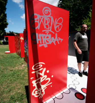 A: As a 21st Century Trojan horse where a dirty word is presented as a 20th modernist sculpture enclosed with its’ minimalistic architecture and painted ruby red on the outside. But when one enters they find themselves surrounded by the imagery of 14 contemporary artists of today, in a visual labyrinth without a roof with open skies above. On the floor, the Austrian artist Patrick Baumüller re-designed a circle pattern from the German children’s game, “trouble”, to depict the four major dialects spoken in the BiH region. As visitors enter the sculpture they will automatically be “in the game”, standing on the various colored circles of the floor, and going from one to another as they move through out the space, they realize that they are the only objects in the space and there-by becoming part of the Arts’ (sculpture’s) content.