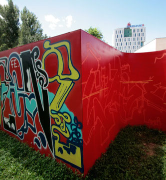 A: A large scale outdoor public sculpture in the shape of the word Outsourcing that also serves as an Exhibition and Performance platform that showcases the imagery of 14 artists from Austria and the BiH region with one French-American.